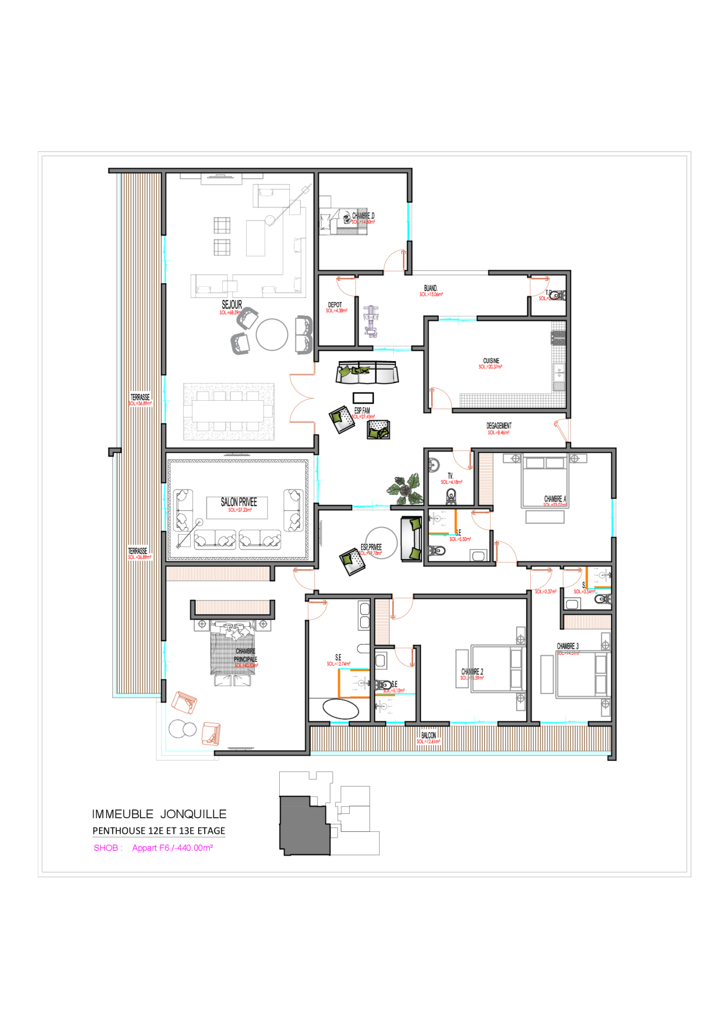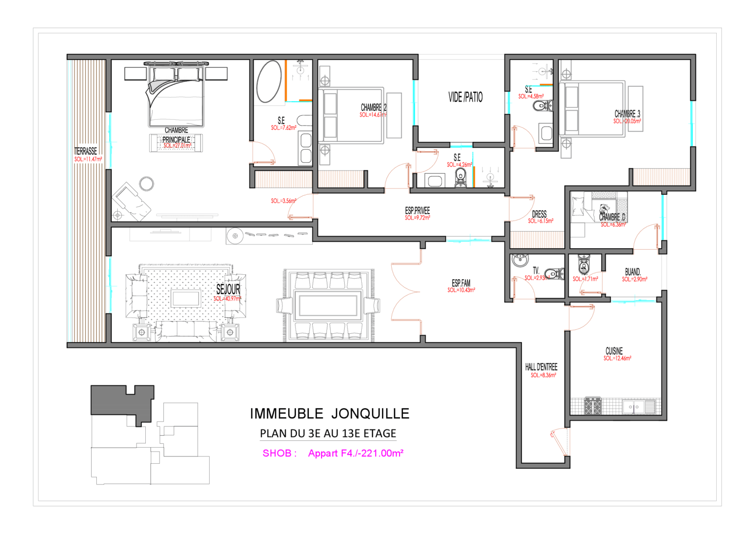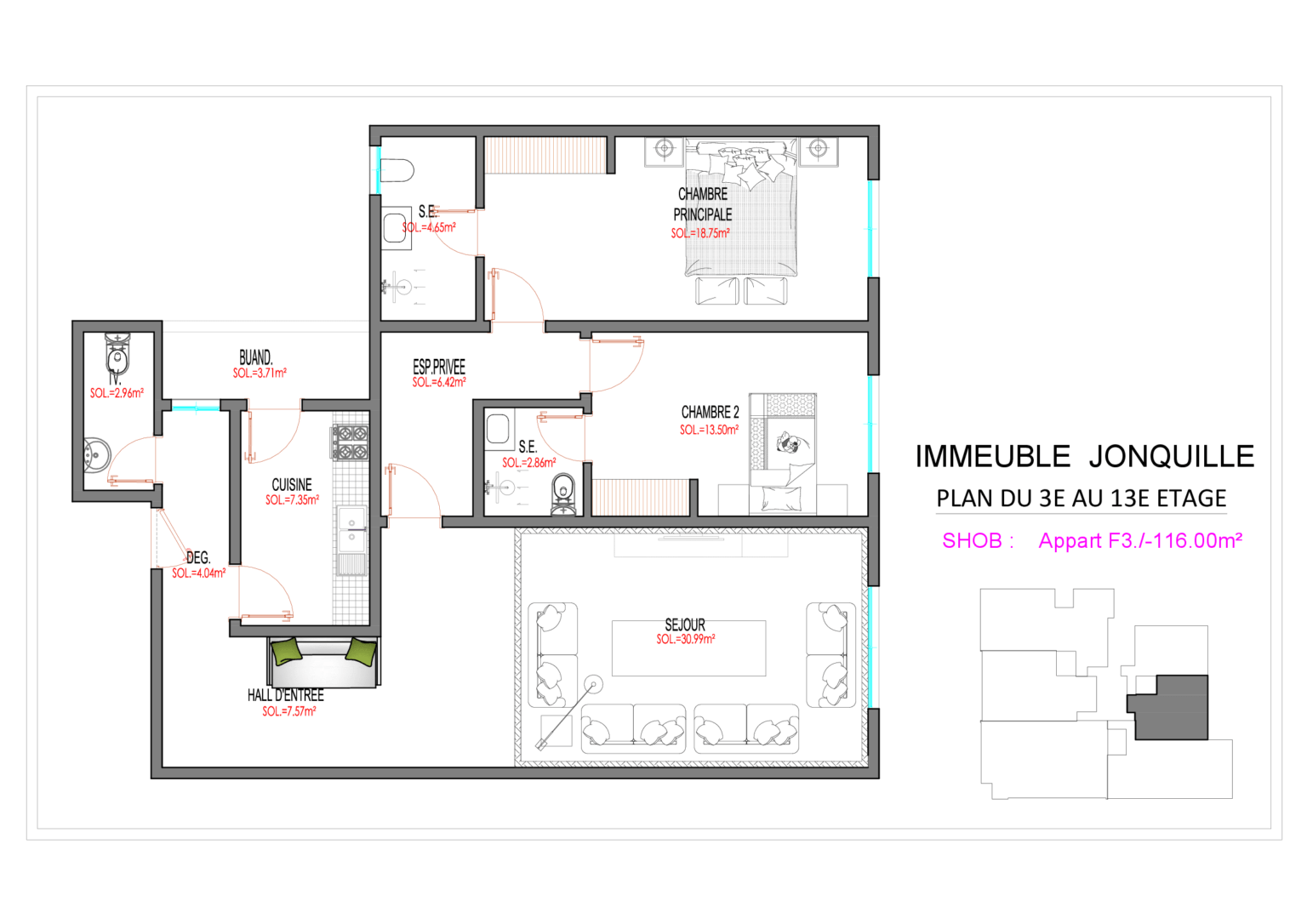 Constitué d’un sous-sol, d’un RDC et de 13 étages, ce projet s’inscrit dans un cadre moderne se traduisant par une offre de commodités de standing, un confort optimal, et une diversité de services offrant aux occupants un climat agréable et sécurisé.
